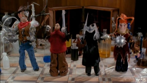 Yeah, I haven’t mentioned much about the toys and puppets that are supposed to be in this movie. Practically every toy/puppet got redesigned for this movie, and while Blade looks identical to earlier films and the other Puppets at least look similar to their earlier selves, the Demonic Toys are look radically different and pale in comparison to their previous incarnations. The puppets wind up getting cyborg upgrades which makes them look silly but thats par for the course in this movie The puppetry is basic and works well for the Demonic Toys, though the Puppet work is a little iffy. Certainly nowhere near the work of earlier titles in the series.