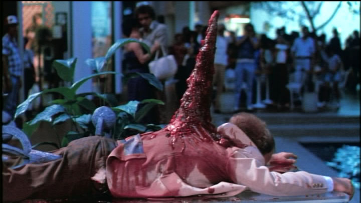 Susan starts letting loose on anyone who just pisses her off. She blows up her drunken ex in his car for ruining her mood at the club. She gives the lecherous gardner exactly what he wants in the bedroom then ruins his weekend by killing him with a claw hammer (why a supernaturally themed film would suddenly become a common slasher film is beyond me.) Even Susan’s aunt gets her rib cage torn out a bit before being dropped over a balcony.. I’ll give the movie some credit, the effects can be gory when it wants to be though the make up effects for Susan’s increasingly demonic possessions look beyond hilarious.