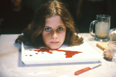 The group of teens we have here are just like any other group in the early 80s, they like to party and horse around. The cast does well enough though there are moments where they’re practically screaming “LOOK AT ME, I MIGHT BE THE KILLER” with the way they act one moment, they must obviously be the killer but a few minutes later everything seems to be fine. A perfect example is when a couple of the students happen upon the head of one of their missing friends and another schoolmate comes out and plays with the severed head just to show that it’s fake and he actually made it himself. He’s a huge suspect until he gets killed off later. Very bizarre, but that’s how the film was marketed!