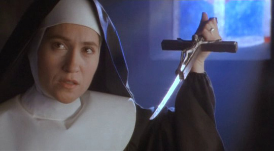Alright, so it’s not scary, but the action is entertaining with a fair amount of gunplay and car chase sequences. The film is not overly bloody, the worst parts you’ll see are the pentagram cuts on the victims’ bodies. There are a few stabbings (still trying to earn that horror cred, huh?) but I was more surprised at the movie’s attempts to NOT show blood. Maybe I have the TV version?