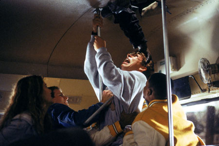 Though there’s a lot of hormonal tension/racism on the bus between the schoolmates –this is set in the south, I think– it’s not long before the Creeper swoops in to take out the teachers and he’s left with a bus load of young victims. He actually picks out the ones he wants, like it’s a lobster tank, yet he pretty much goes after everybody anyway. He tears the bus apart as the teens do their best to fight back, though their numbers do dwindle as the movie goes on. One of the students uses the bus radio to try to call for help and the signal gets picked up by Taggart who is listening on his police scanner for any clues on missing people in the area. He arrives with his eldest son with a makeshift harpoon gun on his truck and they wage their personal war on the Creeper, who just wants some take out before he goes back into hibernation.