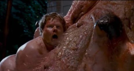 The parasite, being a parasite after all, degrades Grant’s body and he begins to slowly turn into something gruesome though it’s very gradual. When sheriff Bill and his crew show up to talk to Grant after Brenda is deemed missing, Grant takes off for the woods. Bill and the team, and some fellow good samaritans, chase Grant who is now sporting a rubbery, yet lethal, arm. When they come upon a barn, they find Brenda inside though she’s gigantic after being fed so much and she’s about to burst! Hundreds of alien slugs burst from her body and force themselves down the throats of everyone aside from Bill and Starla.