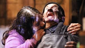 The main plot of the movie concerns two fighting families, the Muldoons and the O’Flynn’s on Plum Island. The current feud is over whether or not they should kill their own who have turned into zombies. The Muldoons choose not to harm their loved ones, even in living death, while the O’Flynn’s try to get a posse together to kill off the brain eaters. Meanwhile, a group of army deserters (seen in the previous film, Diary of the Dead, meeting up with the protagonists of that film) find a YouTube video of Patrick O’Flynn, the eldest of the family, inviting people to Plum Island and telling them just how great the place is. Once they get there, they realize everything’s just as wrong there as it is everywhere else. As they go around the island, they see that zombies are still around, and alive, only chained to certain spots, like the mailman chained near a mailbox. Muldoon has an idea where he tries to get the zombies to eat something other than humans…like horses! This mad man must be stopped…